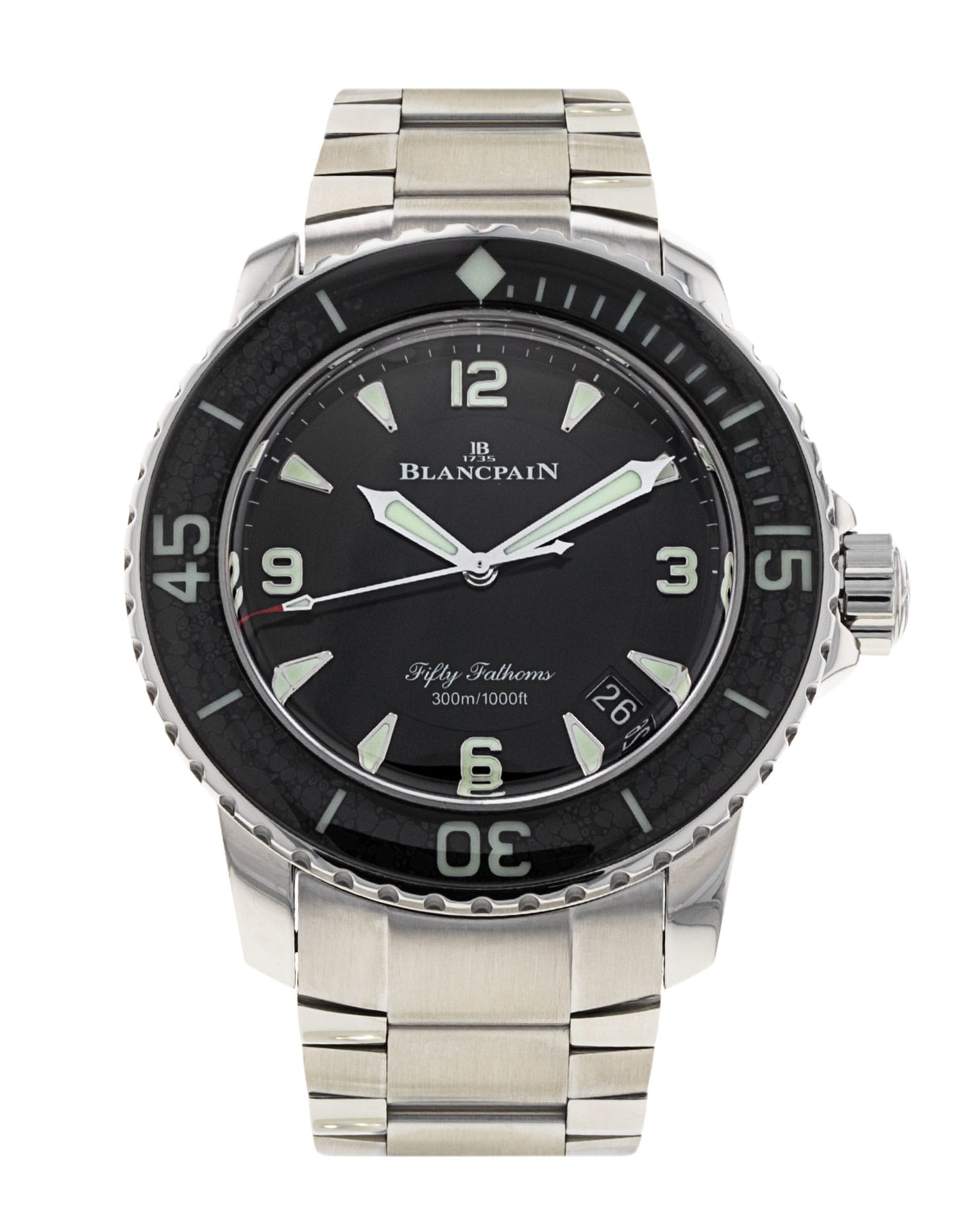 Questo Blancpain Fifty Fathoms 5015C-1130-52B ha un quadrante nero quadrante numeri arabi e un cinturino in bracciale. Questo Blancpain è stato sottoposto a un'accurata ispezione di resistenza all'acqua, precisione, funzionalità e condizioni per determinare il livello di ricondizionamento richiesto per soddisfare i nostri rigorosi standard. È stato anche referenziato rispetto a documenti tecnici e registri del produttore, ove disponibili, per garantire l'autenticità e una cronologia pulita. Tutti i nostri orologi hanno una garanzia di 24 mesi per la tua tranquillità.