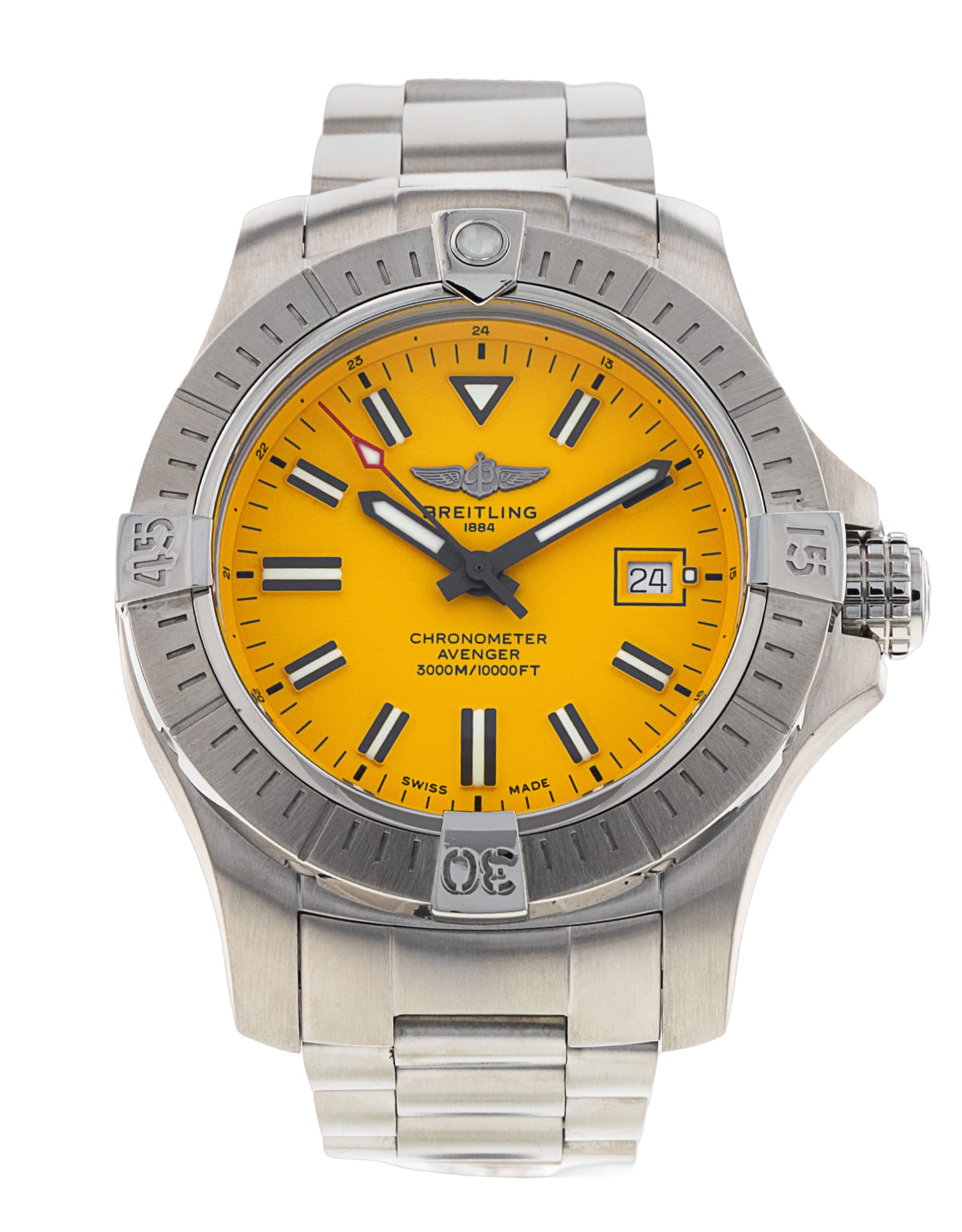Questo Breitling Avenger Automatic 45 A17319 ha un quadrante giallo baton e un cinturino in bracciale. Questo Breitling è stato sottoposto a un'accurata ispezione di resistenza all'acqua, precisione, funzionalità e condizioni per determinare il livello di ricondizionamento richiesto per soddisfare i nostri rigorosi standard. È stato anche referenziato rispetto a documenti tecnici e registri del produttore, ove disponibili, per garantire l'autenticità e una cronologia pulita. Tutti i nostri orologi hanno una garanzia di 24 mesi per la tua tranquillità.