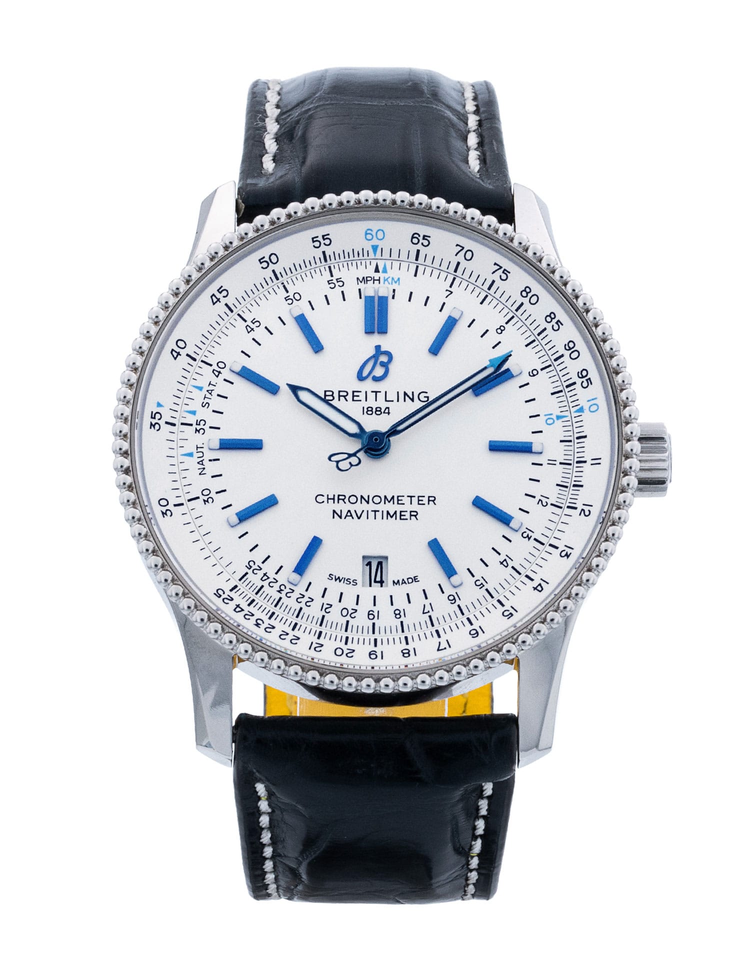 Questo Breitling Navitimer Automatic 41 A17326 ha un quadrante bianco e un cinturino in pelle. Questo Breitling è stato sottoposto a un'accurata ispezione di resistenza all'acqua, precisione, funzionalità e condizioni per determinare il livello di ricondizionamento richiesto per soddisfare i nostri rigorosi standard. È stato anche referenziato rispetto a documenti tecnici e registri del produttore, ove disponibili, per garantire l'autenticità e una cronologia pulita. Tutti i nostri orologi hanno una garanzia di 24 mesi per la tua tranquillità.