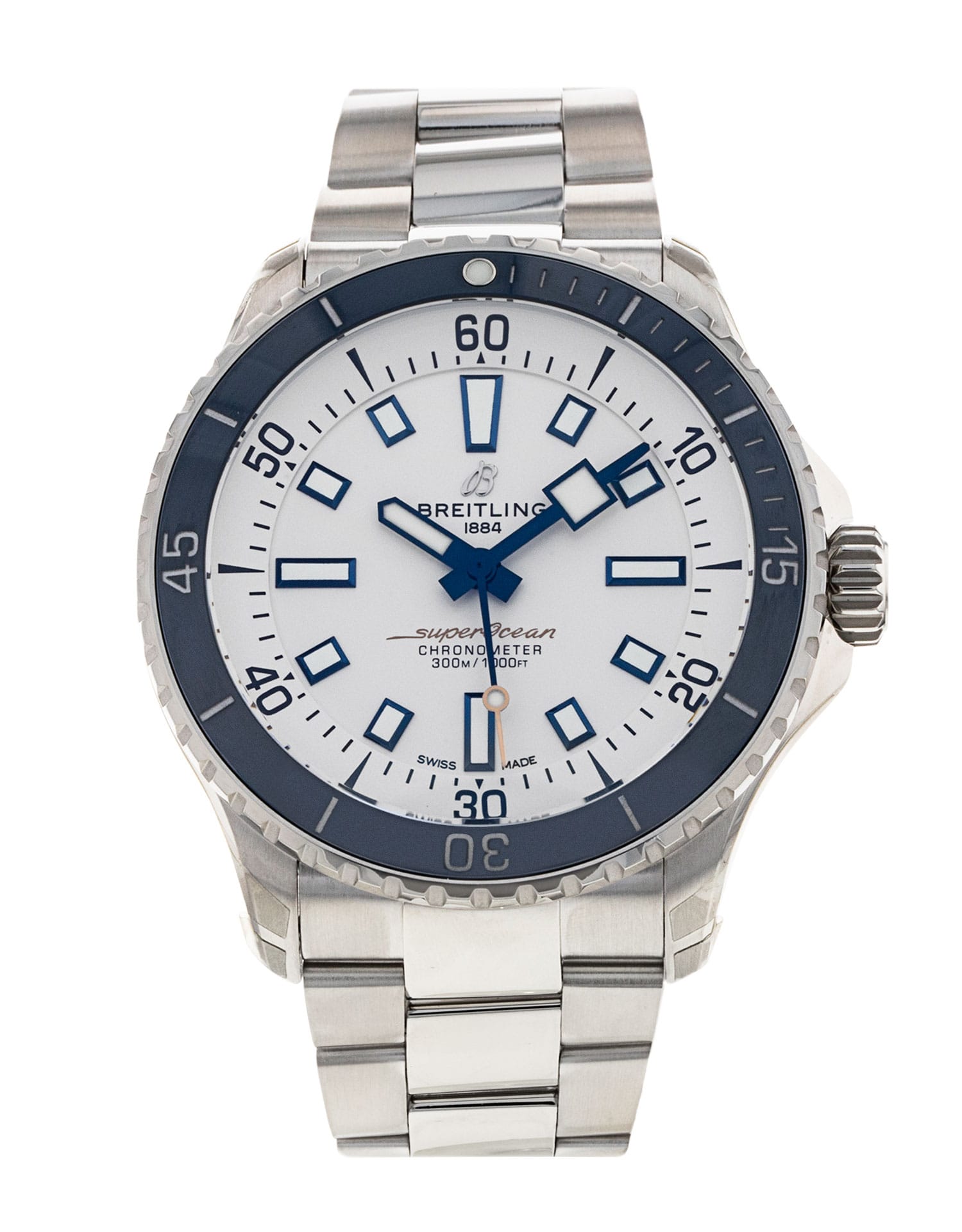 Questo Breitling SuperOcean Automatic 42 A17375 ha un quadrante bianco e un cinturino in bracciale. Questo Breitling è stato sottoposto a un'accurata ispezione di resistenza all'acqua, precisione, funzionalità e condizioni per determinare il livello di ricondizionamento richiesto per soddisfare i nostri rigorosi standard. È stato anche referenziato rispetto a documenti tecnici e registri del produttore, ove disponibili, per garantire l'autenticità e una cronologia pulita. Tutti i nostri orologi hanno una garanzia di 24 mesi per la tua tranquillità.