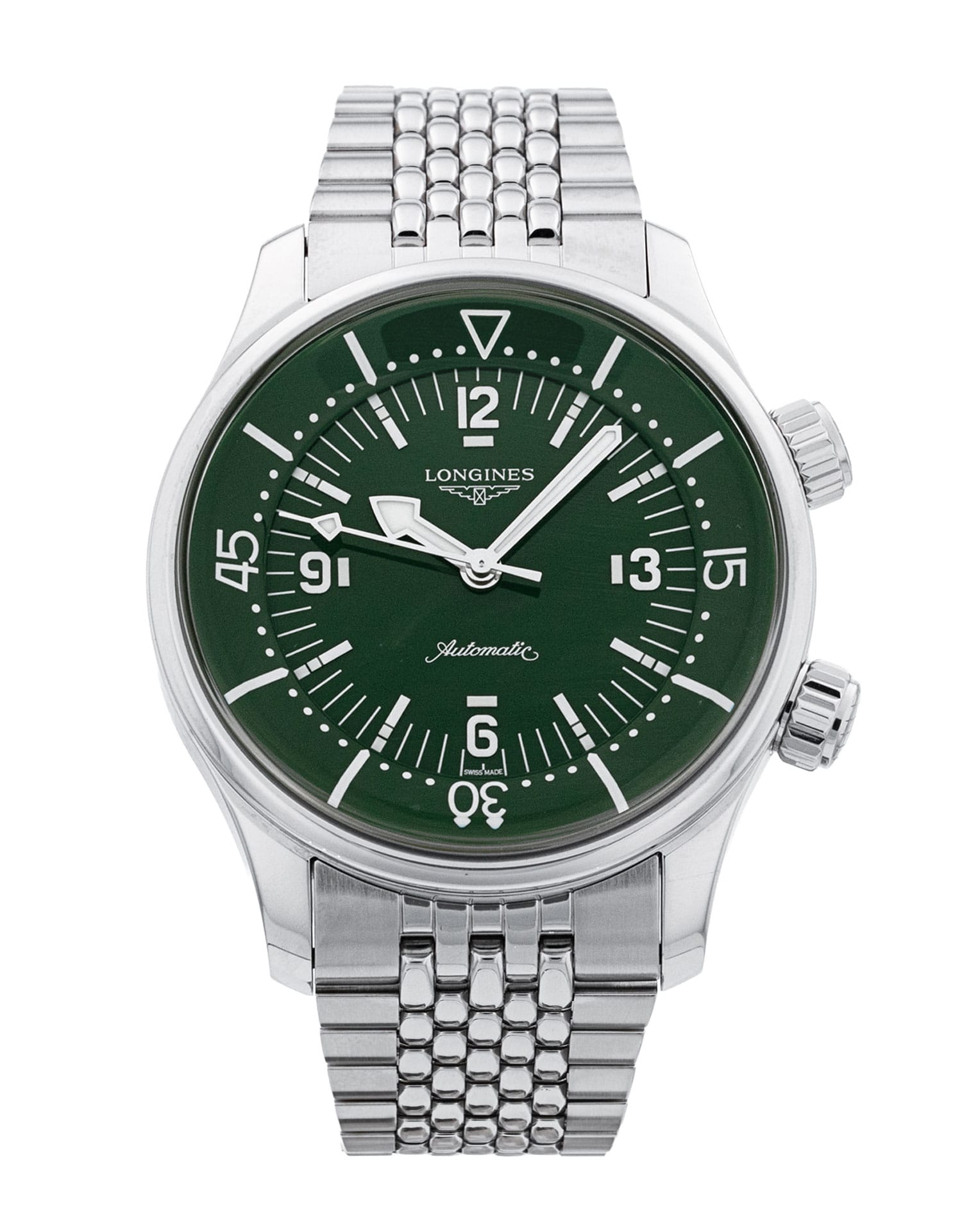 Questo Longines Legend Diver L3.764.4.06.6 ha un quadrante verde quadrante numeri arabi e un cinturino in bracciale. Questo Longines è stato sottoposto a un'accurata ispezione di accuratezza, funzionalità e condizioni presso il nostro centro di assistenza certificato Longines per determinare il livello di ricondizionamento richiesto per soddisfare i nostri rigorosi standard. È stato inoltre verificato nei nostri registri per garantirne l'autenticità. I nostri orologi hanno una garanzia di 24 mesi per vostra maggior tranquillità contestualmente a eventuali garanzie residue del produttore derivate dal nuovo o dalla manutenzione.