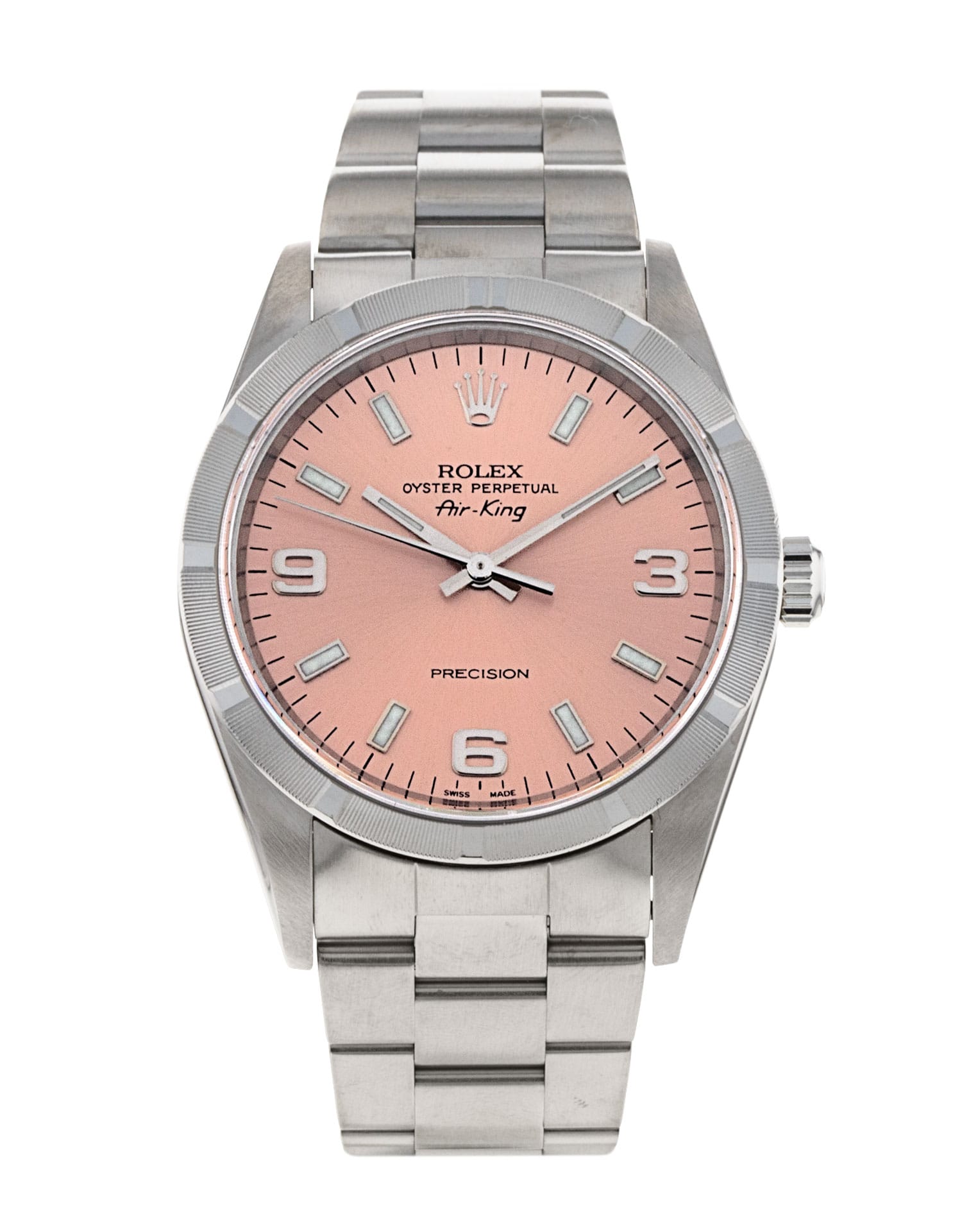 Questo Rolex Air-King 14010 ha un quadrante salmone quadrante numeri arabi e un cinturino in bracciale. Questo Rolex è stato sottoposto a un'accurata ispezione di resistenza all'acqua, precisione, funzionalità e condizioni per determinare il livello di ricondizionamento richiesto per soddisfare i nostri rigorosi standard. È stato anche referenziato rispetto a documenti tecnici e registri del produttore, ove disponibili, per garantire l'autenticità e una cronologia pulita. Tutti i nostri orologi hanno una garanzia di 24 mesi per la tua tranquillità. Uno dei nostri tecnici specializzati nella lucidatura ha rimosso i segni sulla cassa e sul bracciale di questo orologio, causati dall’usura quotidiana, motivo per cui questo orologio non viene fornito con la garanzia residua del produttore.