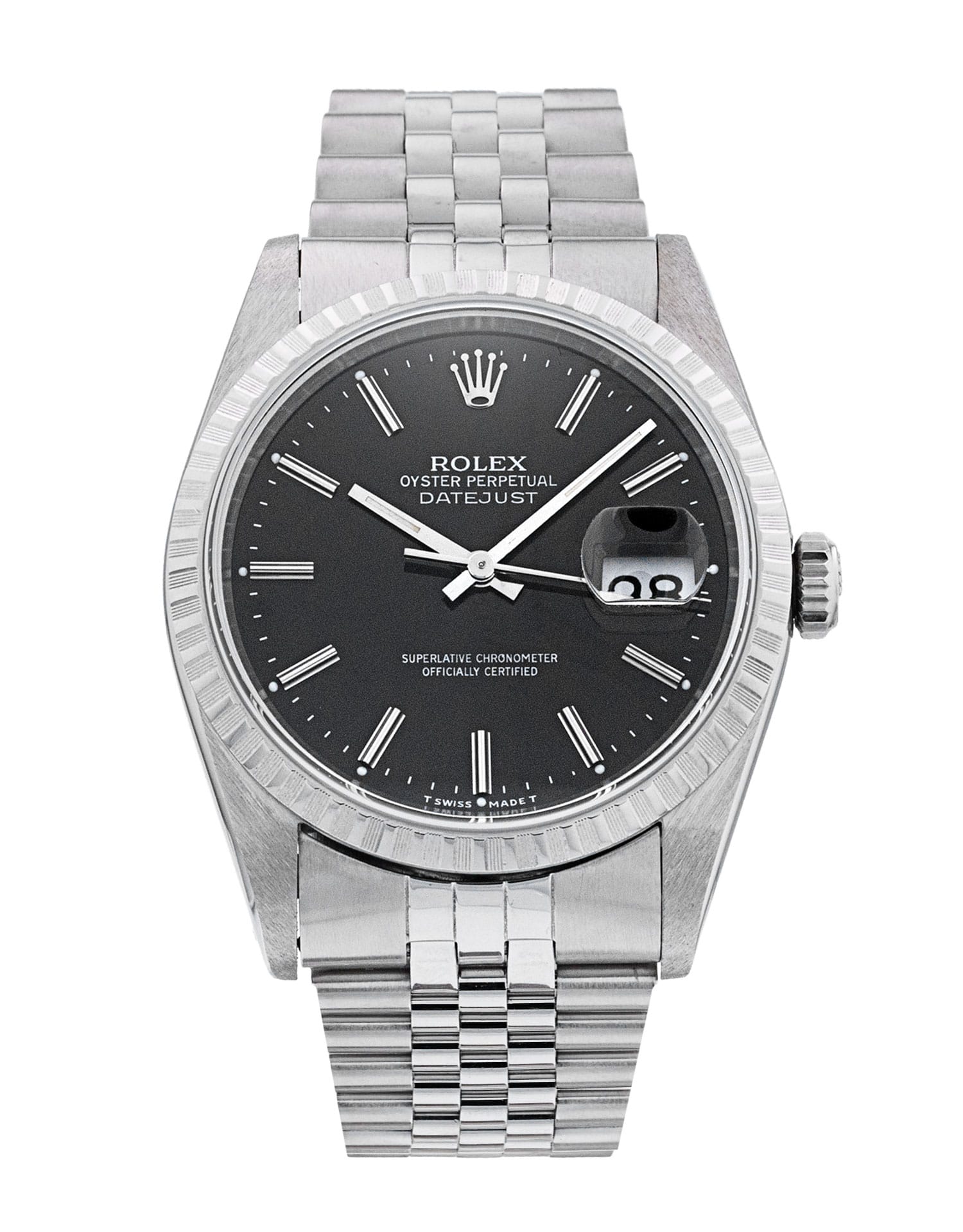 Questo Rolex Datejust 16220 ha un quadrante black baton - roman numeral e un cinturino in bracciale. Questo Rolex è stato sottoposto a un'accurata ispezione di resistenza all'acqua, precisione, funzionalità e condizioni per determinare il livello di ricondizionamento richiesto per soddisfare i nostri rigorosi standard. È stato anche referenziato rispetto a documenti tecnici e registri del produttore, ove disponibili, per garantire l'autenticità e una cronologia pulita. Tutti i nostri orologi hanno una garanzia di 24 mesi per la tua tranquillità. Uno dei nostri tecnici specializzati nella lucidatura ha rimosso i segni sulla cassa e sul bracciale di questo orologio, causati dall’usura quotidiana, motivo per cui questo orologio non viene fornito con la garanzia residua del produttore.