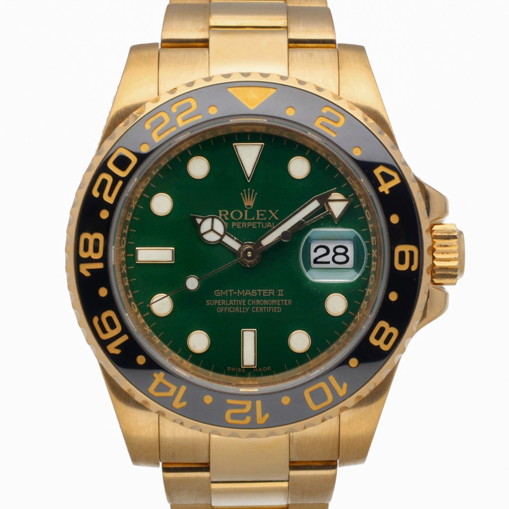 Questo Rolex GMT Master II 116718 LN ha un quadrante verde e un cinturino in bracciale. Questo Rolex è stato sottoposto a un'accurata ispezione di resistenza all'acqua, precisione, funzionalità e condizioni per determinare il livello di ricondizionamento richiesto per soddisfare i nostri rigorosi standard. È stato anche referenziato rispetto a documenti tecnici e registri del produttore, ove disponibili, per garantire l'autenticità e una cronologia pulita. Tutti i nostri orologi hanno una garanzia di 24 mesi per la tua tranquillità. Uno dei nostri tecnici specializzati nella lucidatura ha rimosso i segni sulla cassa e sul bracciale di questo orologio, causati dall’usura quotidiana, motivo per cui questo orologio non viene fornito con la garanzia residua del produttore.