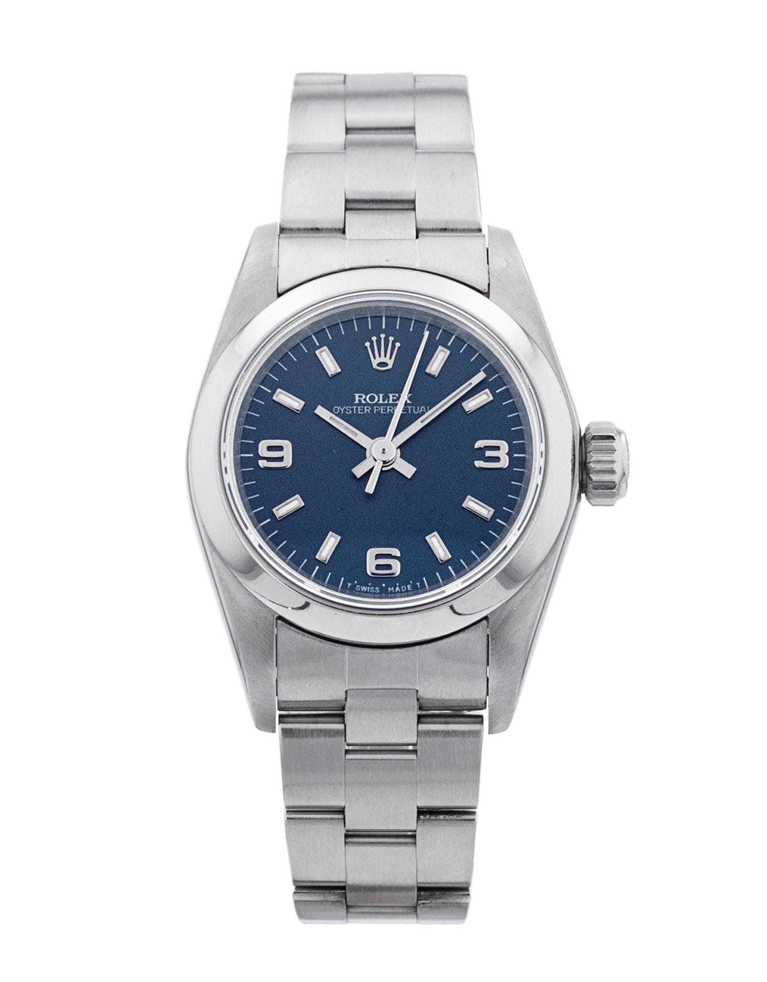 Questo Rolex Lady Oyster Perpetual 67180 ha un quadrante blu quarter numeri arabi e un cinturino in bracciale. Questo Rolex è stato sottoposto a un'accurata ispezione di resistenza all'acqua, precisione, funzionalità e condizioni per determinare il livello di ricondizionamento richiesto per soddisfare i nostri rigorosi standard. È stato anche referenziato rispetto a documenti tecnici e registri del produttore, ove disponibili, per garantire l'autenticità e una cronologia pulita. Tutti i nostri orologi hanno una garanzia di 24 mesi per la tua tranquillità. Uno dei nostri tecnici specializzati nella lucidatura ha rimosso i segni sulla cassa e sul bracciale di questo orologio, causati dall’usura quotidiana, motivo per cui questo orologio non viene fornito con la garanzia residua del produttore.