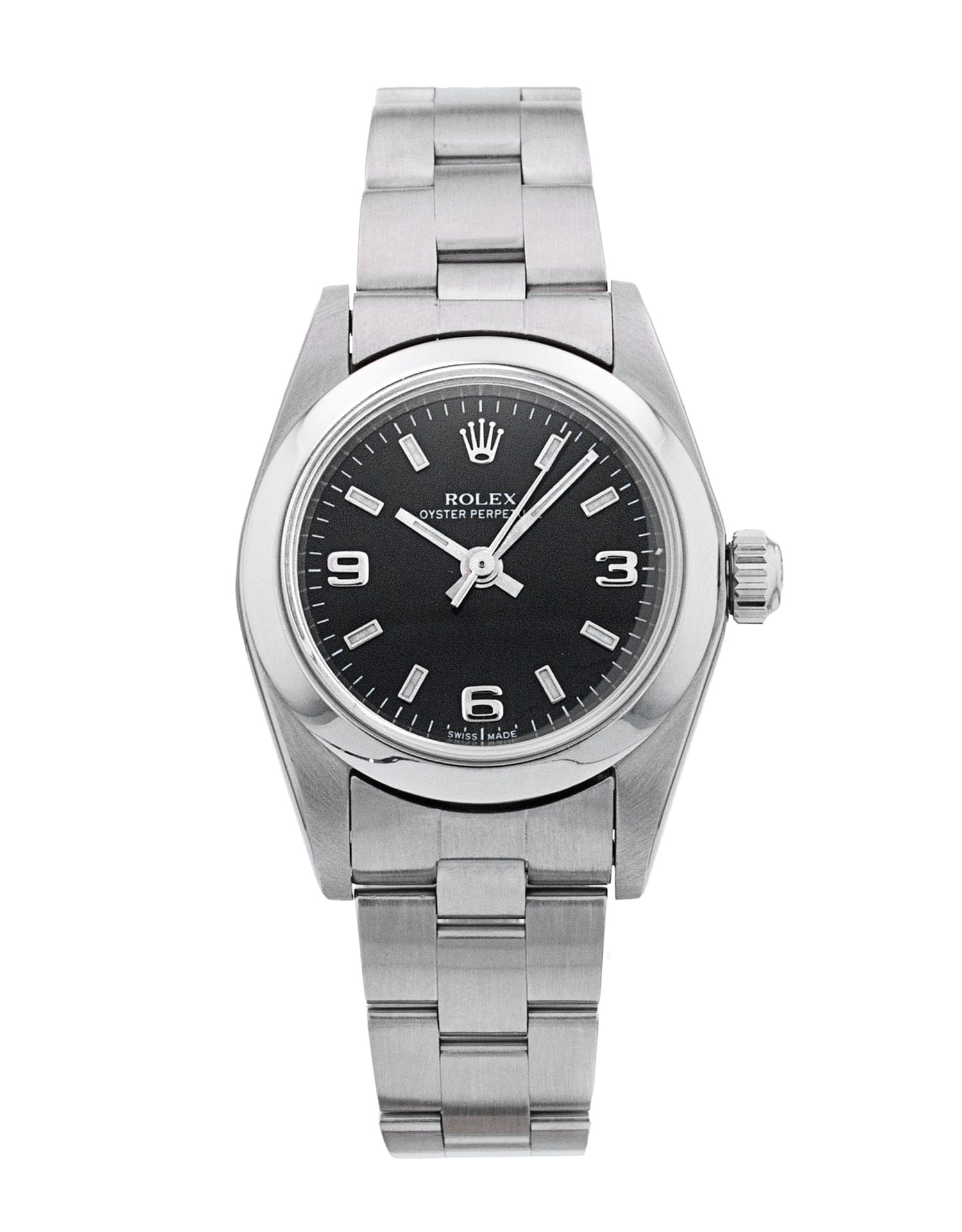 Questo Rolex Lady Oyster Perpetual 76080 ha un quadrante nero quadrante numeri arabi e un cinturino in bracciale. Questo Rolex è stato sottoposto a un'accurata ispezione di resistenza all'acqua, precisione, funzionalità e condizioni per determinare il livello di ricondizionamento richiesto per soddisfare i nostri rigorosi standard. È stato anche referenziato rispetto a documenti tecnici e registri del produttore, ove disponibili, per garantire l'autenticità e una cronologia pulita. Tutti i nostri orologi hanno una garanzia di 24 mesi per la tua tranquillità. Uno dei nostri tecnici specializzati nella lucidatura ha rimosso i segni sulla cassa e sul bracciale di questo orologio, causati dall’usura quotidiana, motivo per cui questo orologio non viene fornito con la garanzia residua del produttore.