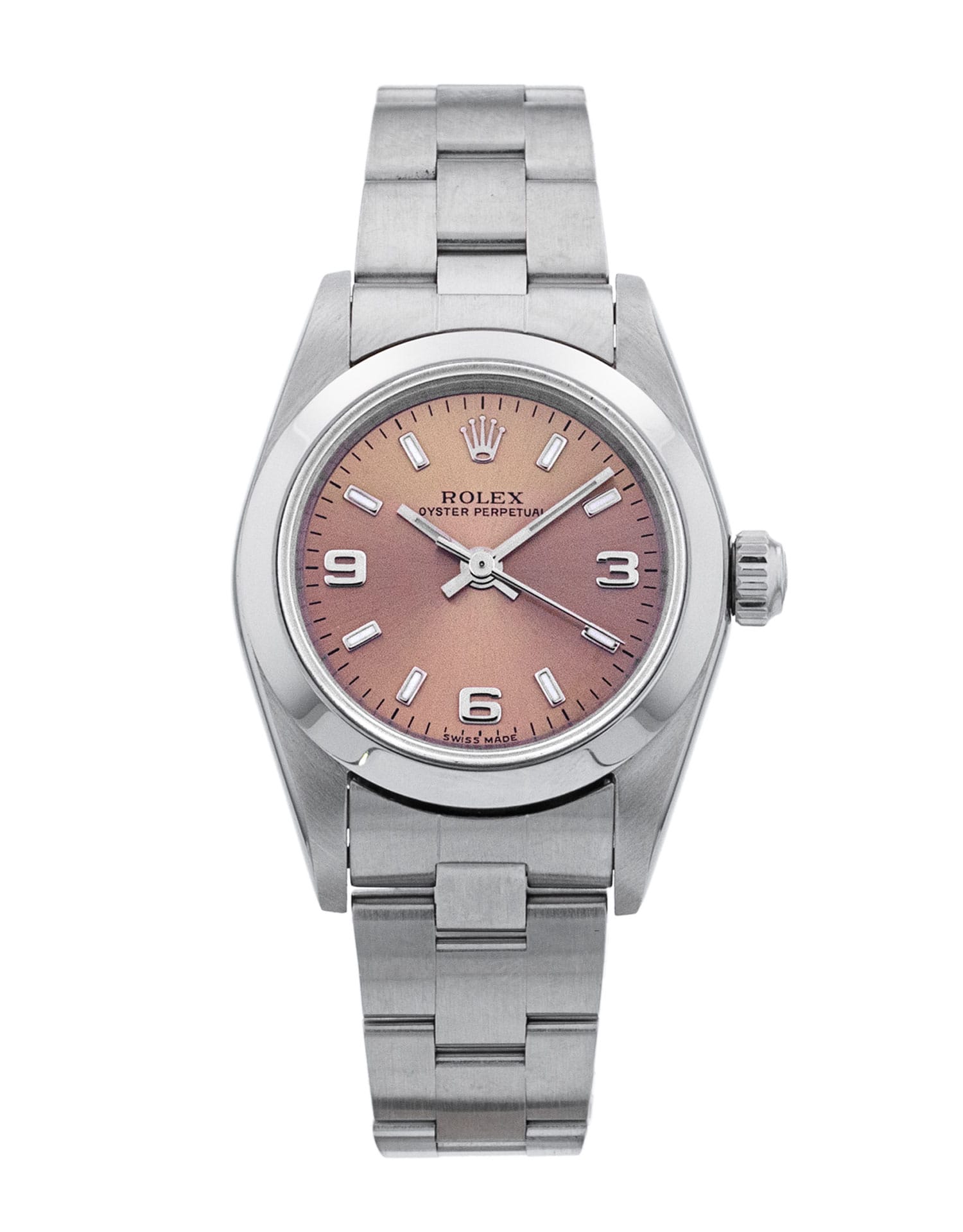 Questo Rolex Lady Oyster Perpetual 76080 ha un quadrante salmone quadrante numeri arabi e un cinturino in bracciale. Questo Rolex è stato sottoposto a un'accurata ispezione di resistenza all'acqua, precisione, funzionalità e condizioni per determinare il livello di ricondizionamento richiesto per soddisfare i nostri rigorosi standard. È stato anche referenziato rispetto a documenti tecnici e registri del produttore, ove disponibili, per garantire l'autenticità e una cronologia pulita. Tutti i nostri orologi hanno una garanzia di 24 mesi per la tua tranquillità. Uno dei nostri tecnici specializzati nella lucidatura ha rimosso i segni sulla cassa e sul bracciale di questo orologio, causati dall’usura quotidiana, motivo per cui questo orologio non viene fornito con la garanzia residua del produttore.
