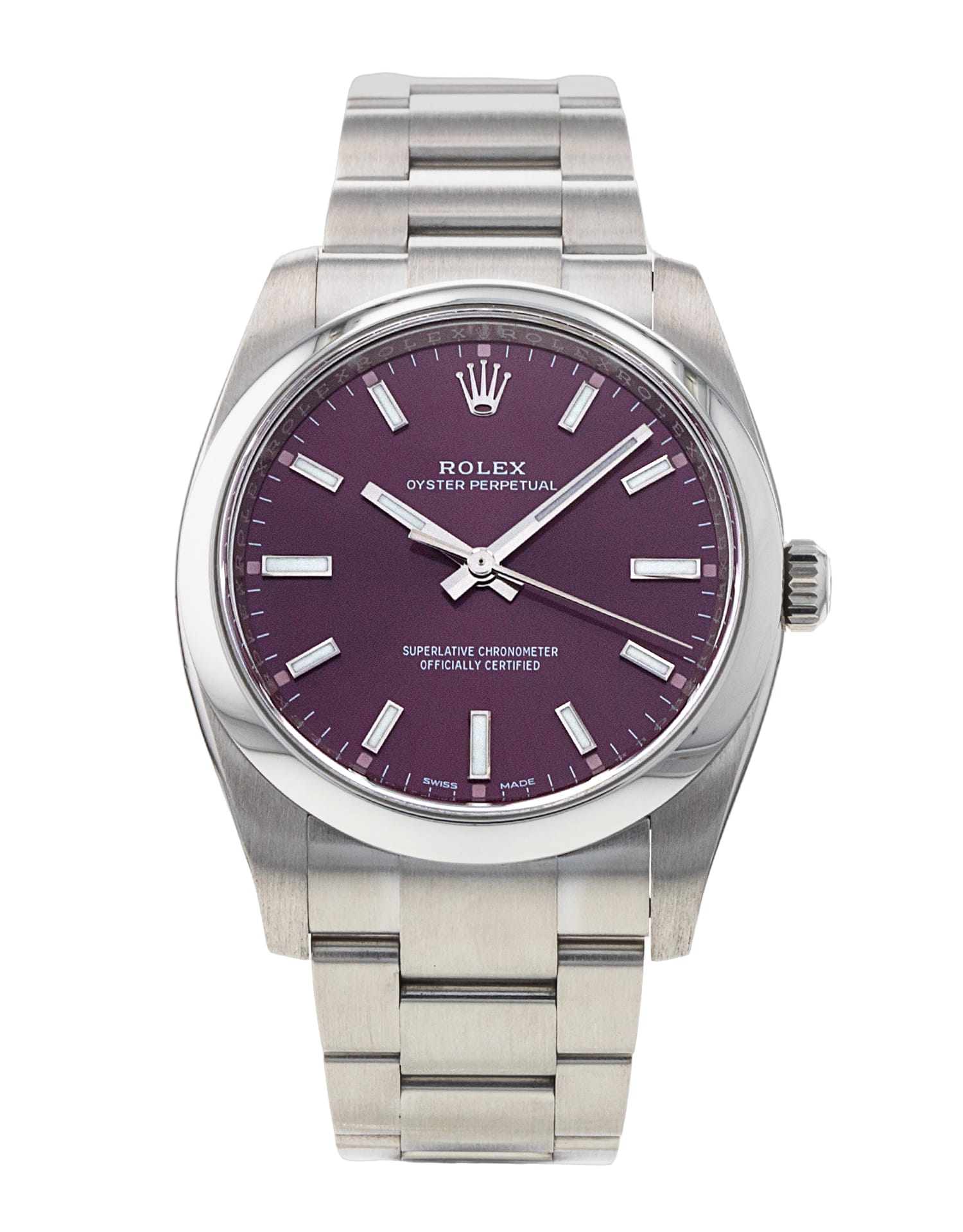 Questo Rolex Oyster Perpetual 114200 ha un quadrante red grape e un cinturino in bracciale. Questo Rolex è stato sottoposto a un'accurata ispezione di resistenza all'acqua, precisione, funzionalità e condizioni per determinare il livello di ricondizionamento richiesto per soddisfare i nostri rigorosi standard. È stato anche referenziato rispetto a documenti tecnici e registri del produttore, ove disponibili, per garantire l'autenticità e una cronologia pulita. Tutti i nostri orologi hanno una garanzia di 24 mesi per la tua tranquillità. Uno dei nostri tecnici specializzati nella lucidatura ha rimosso i segni sulla cassa e sul bracciale di questo orologio, causati dall’usura quotidiana, motivo per cui questo orologio non viene fornito con la garanzia residua del produttore.