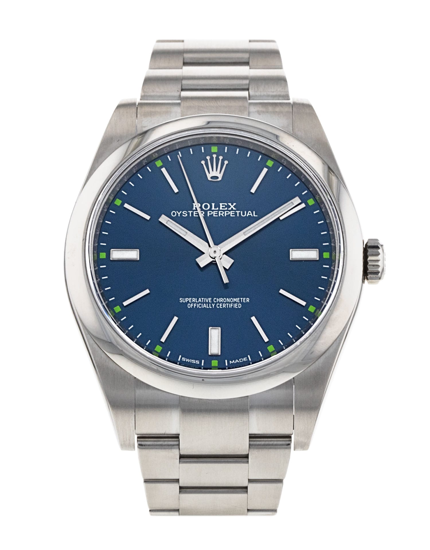 Questo Rolex Oyster Perpetual 114300 ha un quadrante blu baton e un cinturino in bracciale. Questo Rolex è stato sottoposto a un'accurata ispezione di resistenza all'acqua, precisione, funzionalità e condizioni per determinare il livello di ricondizionamento richiesto per soddisfare i nostri rigorosi standard. È stato anche referenziato rispetto a documenti tecnici e registri del produttore, ove disponibili, per garantire l'autenticità e una cronologia pulita. Tutti i nostri orologi hanno una garanzia di 24 mesi per la tua tranquillità. Uno dei nostri tecnici specializzati nella lucidatura ha rimosso i segni sulla cassa e sul bracciale di questo orologio, causati dall’usura quotidiana, motivo per cui questo orologio non viene fornito con la garanzia residua del produttore.