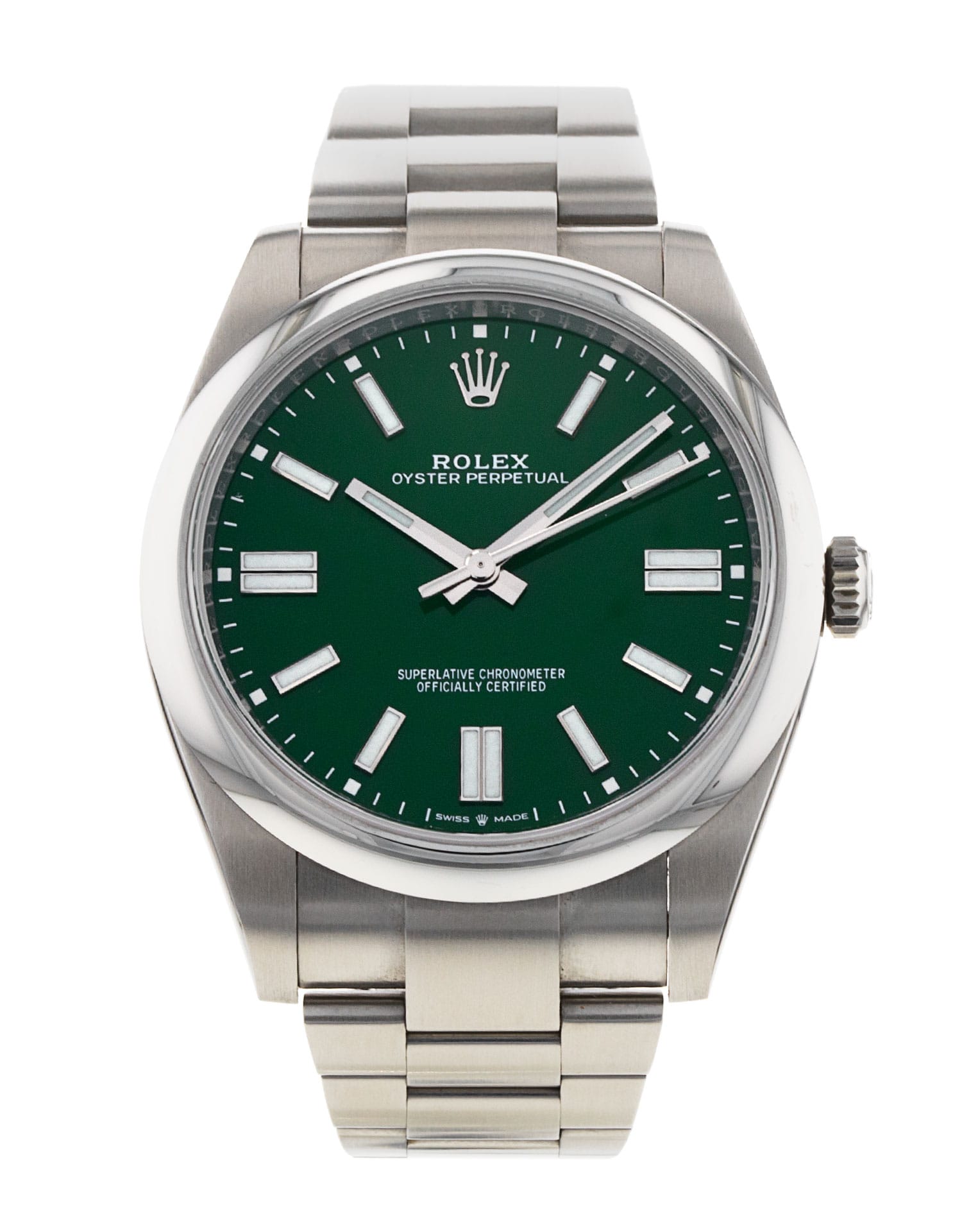 Questo Rolex Oyster Perpetual 124300 ha un quadrante verde baton e un cinturino in bracciale. Questo Rolex è stato sottoposto a un'accurata ispezione di resistenza all'acqua, precisione, funzionalità e condizioni per determinare il livello di ricondizionamento richiesto per soddisfare i nostri rigorosi standard. È stato anche referenziato rispetto a documenti tecnici e registri del produttore, ove disponibili, per garantire l'autenticità e una cronologia pulita. I nostri orologi hanno una garanzia di 24 mesi per vostra maggior tranquillità contestualmente a eventuali garanzie residue del produttore derivate dal nuovo o dalla manutenzione. Per mantenere la garanzia del produttore su questo prodotto, l’orologio non è stato lucidato nel nostro centro di assistenza.