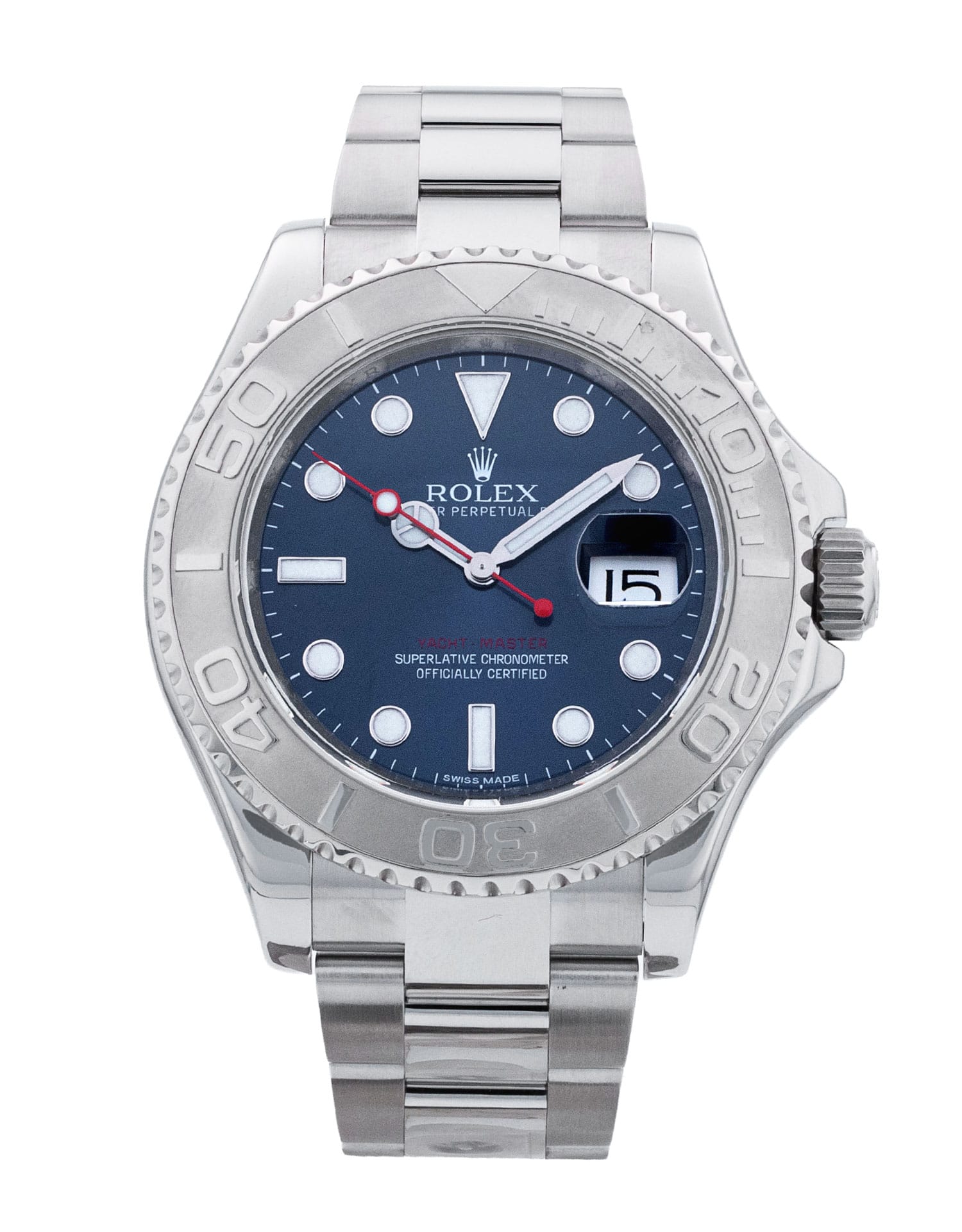 Questo Rolex Yacht-Master 116622 ha un quadrante blu e un cinturino in bracciale. Questo Rolex è stato sottoposto a un'accurata ispezione di resistenza all'acqua, precisione, funzionalità e condizioni per determinare il livello di ricondizionamento richiesto per soddisfare i nostri rigorosi standard. È stato anche referenziato rispetto a documenti tecnici e registri del produttore, ove disponibili, per garantire l'autenticità e una cronologia pulita. I nostri orologi hanno una garanzia di 24 mesi per vostra maggior tranquillità contestualmente a eventuali garanzie residue del produttore derivate dal nuovo o dalla manutenzione. Per mantenere la garanzia del produttore su questo prodotto, l’orologio non è stato lucidato nel nostro centro di assistenza.