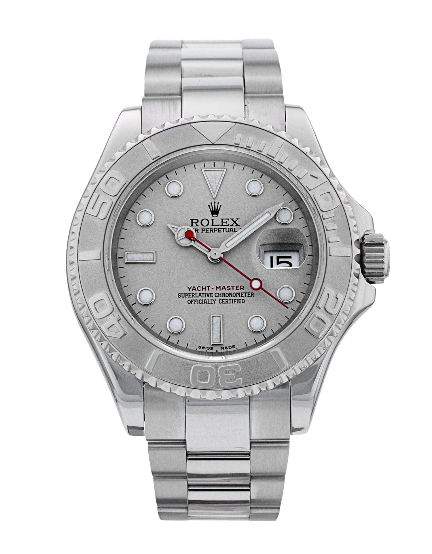 Questo Rolex Yacht-Master 16622 ha un quadrante platino e un cinturino in bracciale. Questo Rolex è stato sottoposto a un'accurata ispezione di resistenza all'acqua, precisione, funzionalità e condizioni per determinare il livello di ricondizionamento richiesto per soddisfare i nostri rigorosi standard. È stato anche referenziato rispetto a documenti tecnici e registri del produttore, ove disponibili, per garantire l'autenticità e una cronologia pulita. Tutti i nostri orologi hanno una garanzia di 24 mesi per la tua tranquillità. Uno dei nostri tecnici specializzati nella lucidatura ha rimosso i segni sulla cassa e sul bracciale di questo orologio, causati dall’usura quotidiana, motivo per cui questo orologio non viene fornito con la garanzia residua del produttore.